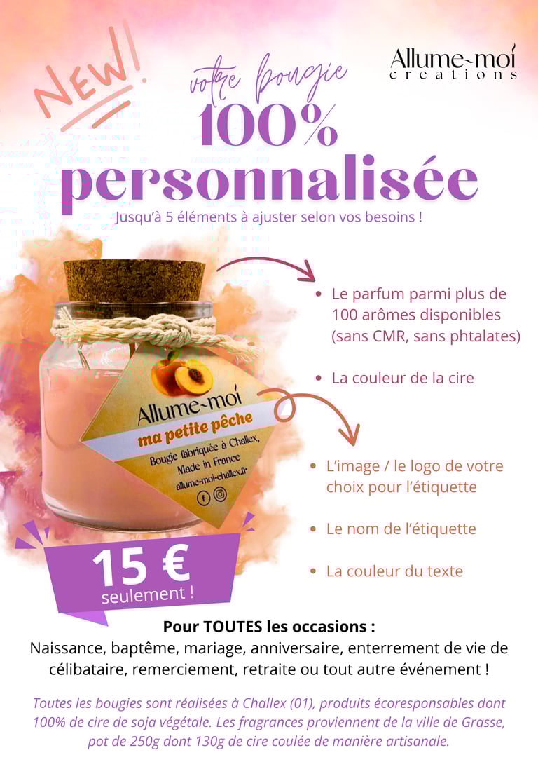 Dès maintenant, contactez-nous pour créer votre bougie 100% personnalisée avec votre parfum, vos couleurs, vos images et vos textes !